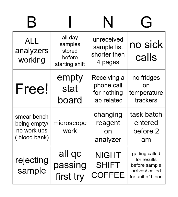 This bingo card has 16 words: all qc passing first try, task batch entered before 2 am, unreceived sample list shorter then 4 pages, ALL analyzers working, smear bench being empty/ no work ups ( blood bank), all day samples stored before starting shift, changing reagent on analyzer, NIGHT SHIFT COFFEE, Free!, empty stat board, rejecting sample, no sick calls, microscope work, no fridges on temperature trackers, Receiving a phone call for nothing lab related and getting called for results before sample arrives/ called for unit of blood.