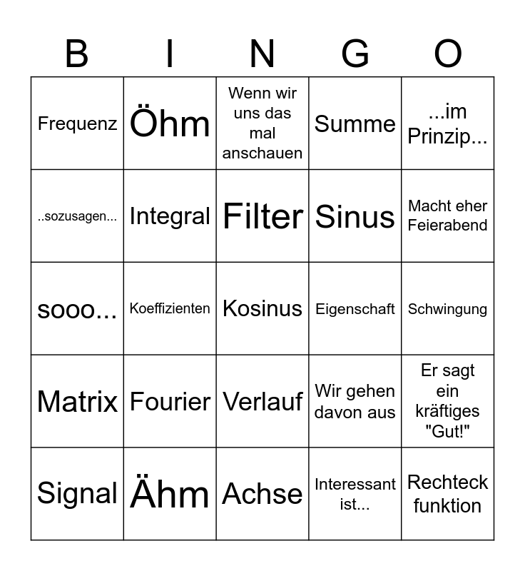 This bingo card has a free space and 24 words: Fourier, Ähm, Filter, Signal, ...im Prinzip..., Frequenz, ..sozusagen..., Öhm, Eigenschaft, Verlauf, Sinus, sooo..., Wir gehen davon aus, Er sagt ein kräftiges "Gut!", Integral, Interessant ist..., Schwingung, Wenn wir uns das mal anschauen, Macht eher Feierabend, Koeffizienten, Rechteck funktion, Matrix, Summe and Achse.