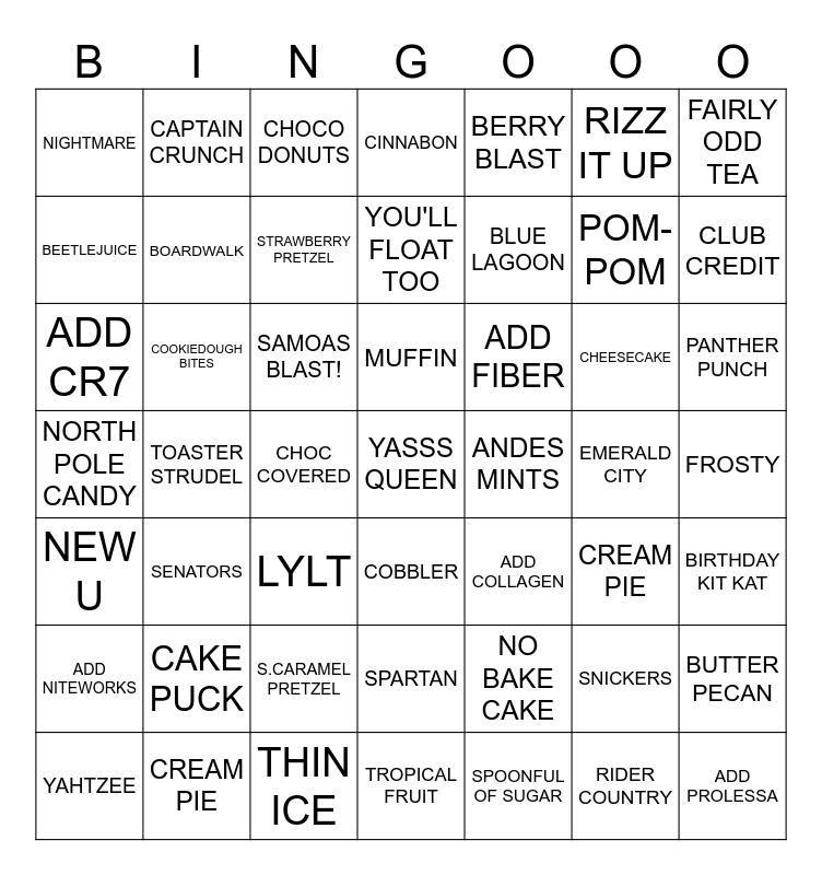 This bingo card has 101 words: Free!, SNICKERS, BERRY BLAST, BUTTERFINGER, CHOC PB BANANA, REESES CUP, BANANA BERRY, HEATH BAR, STRAWBERRY BANANA, SUGAR COOKIE BAR, PB STRAWBERRY, HERSHY BAR, TROPICAL FRUIT, ANDES MINTS, MANGO DELIGHT, BIRTHDAY KIT KAT, COOKIEDOUGH BITES, PINEAPPLE DOLE WHIP, OREOS & CREAM, CAMPFIRE SMORES, MOOSETRACKS, ORANGE CREAM, BUTTER PECAN, COFFEE CAKE, S.CARAMEL PRETZEL, STRAWBERRY PRETZEL, CINNABON, SAMOAS BLAST!, CINN TOAST CRUNCH, FRUITY PEBBLES, CAPTAIN CRUNCH, CHOCO DONUTS, LUCKY CHARMS, CREAM PIE, COBBLER, MUFFIN, NO BAKE CAKE, CHEESECAKE, CHOC COVERED, TOASTER STRUDEL, RIDER COUNTRY, PANTHER PUNCH, SPARTAN, SENATORS, LYLT, POM-POM, NERDS, NEW U, HEY KING, YASSS QUEEN, BOUJEE, RIZZ IT UP, EMERALD CITY, RUBY SLIPPER, LOLLIPOP GUILD, DEFYING GRAVITY, OHANA COLADA, INFINITY & BEYOND, URSULA, SPOONFUL OF SUGAR, FAIRLY ODD TEA, BLUES CLUES, PINEAPPLE UNDER THE SEA, WILD THORNBERRY, LAWN PARTY, BOARDWALK, VIOLET LEMONADE, BLUE LAGOON, NORTH POLE CANDY, SLEIGH IT, FLASHING LIGHTS, FROSTY, NIGHTMARE, HOCUS POCUS, BEETLEJUICE, YOU'LL FLOAT TOO, THIN ICE, TROUBLE, CANDYLAND, YAHTZEE, OPERATION, CAKE PUCK, CLUB CREDIT, BOTTLED MOCKTAIL, ADD COLLAGEN, ADD NITEWORKS, ADD CR7, ADD PROBIOTIC, ADD PROLESSA, ADD BEST DEFENSE, ADD FIBER, CREAM PIE, COBBLER, MUFFIN, NO BAKE CAKE, CHEESECAKE, CHOC COVERED, TOASTER STRUDEL, CAKE PUCK, BOTTLED MOCKTAIL and LEAVE A TIP.