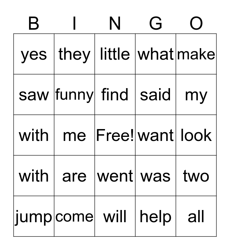 This bingo card has a free space and 24 words: are, come, find, jump, make, yes, saw, they, want, went, said, with, was, two, funny, help, look, little, my, me, all, with, what and will.