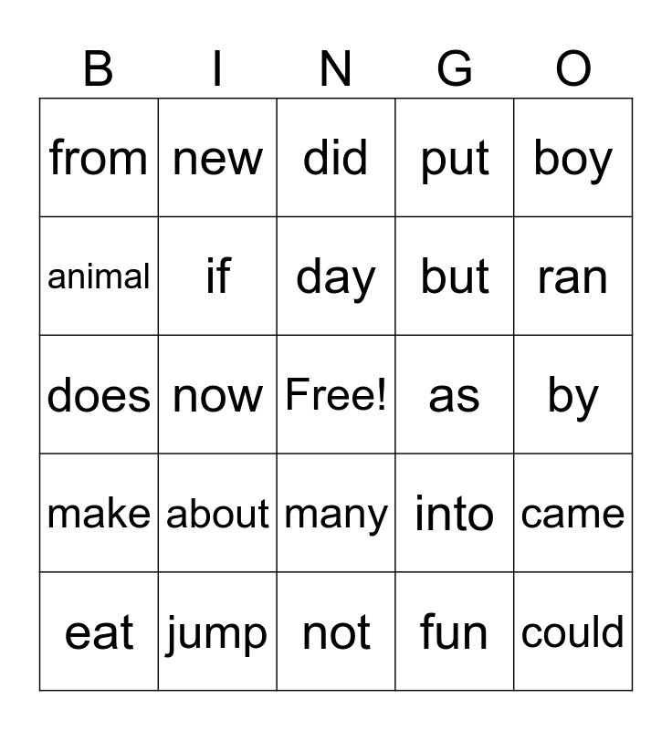 This bingo card has a free space and 24 words: about, jump, day, eat, boy, from, animal, new, as, many, but, does, into, came, if, fun, by, did, ran, now, could, make, put and not.