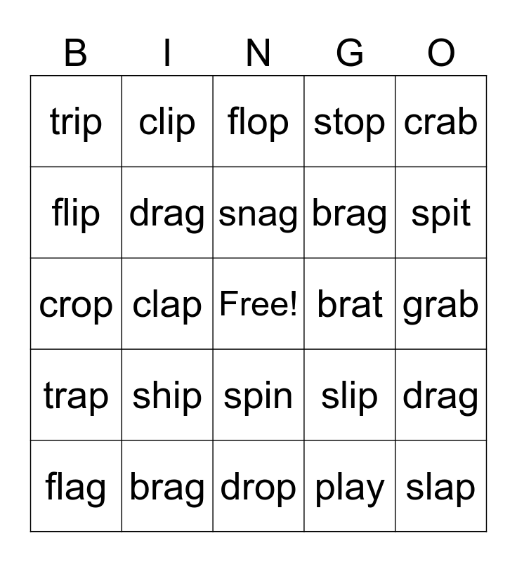 This bingo card has a free space and 24 words: ship, brag, snag, flag, crab, trip, flip, clip, brat, spin, brag, crop, slip, drag, drag, play, grab, flop, spit, clap, slap, trap, stop and drop.