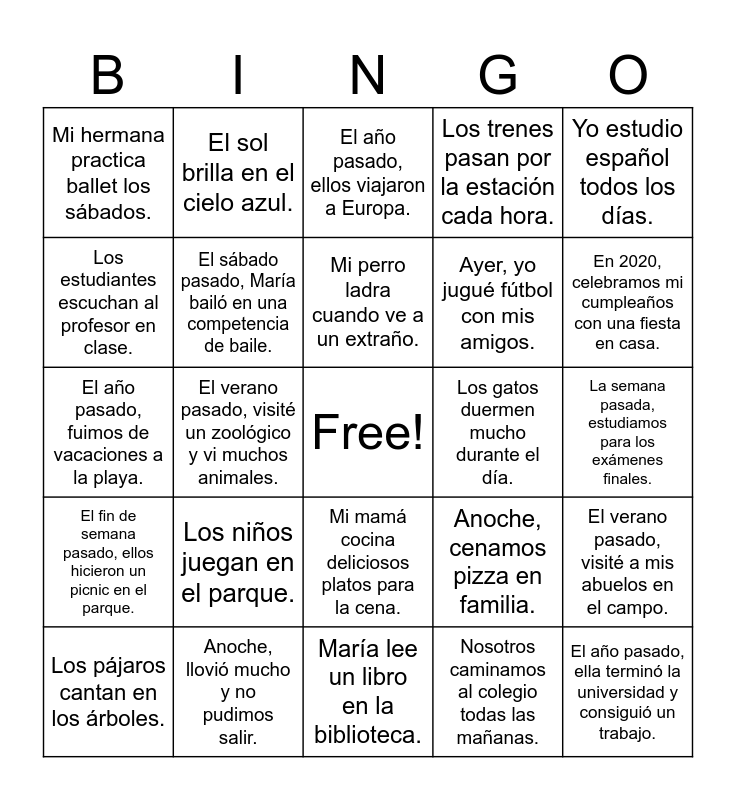 This bingo card has a free space and 25 words: Los niños juegan en el parque., María lee un libro en la biblioteca., Mi perro ladra cuando ve a un extraño., Los pájaros cantan en los árboles., Yo estudio español todos los días., Mi hermana practica ballet los sábados., Los estudiantes escuchan al profesor en clase., El sol brilla en el cielo azul., Los gatos duermen mucho durante el día., Mi mamá cocina deliciosos platos para la cena., Ayer, yo jugué fútbol con mis amigos., El año pasado, fuimos de vacaciones a la playa., Anoche, cenamos pizza en familia., El verano pasado, visité a mis abuelos en el campo., El sábado pasado, María bailó en una competencia de baile., El mes pasado, él compró un coche nuevo., La semana pasada, estudiamos para los exámenes finales., El año pasado, ellos viajaron a Europa., En 2020, celebramos mi cumpleaños con una fiesta en casa., El verano pasado, visité un zoológico y vi muchos animales., El año pasado, ella terminó la universidad y consiguió un trabajo., Anoche, llovió mucho y no pudimos salir., El fin de semana pasado, ellos hicieron un picnic en el parque., Los trenes pasan por la estación cada hora. and Nosotros caminamos al colegio todas las mañanas..