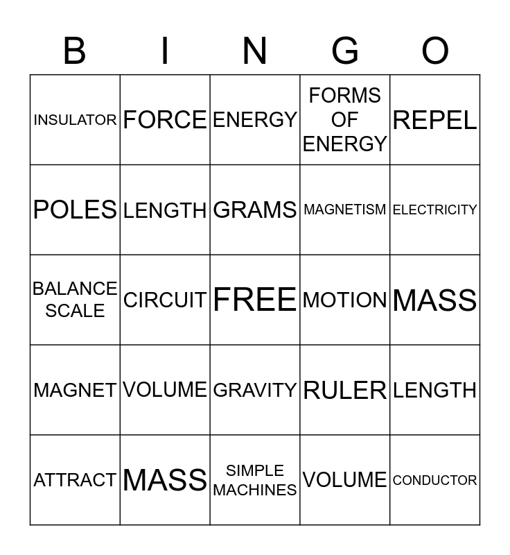 This bingo card has a free space and 24 words: VOLUME, MASS, GRAMS, ATTRACT, REPEL, INSULATOR, POLES, FORCE, MOTION, GRAVITY, MAGNETISM, BALANCE SCALE, RULER, LENGTH, LENGTH, VOLUME, MASS, ENERGY, ELECTRICITY, CIRCUIT, CONDUCTOR, MAGNET, FORMS OF ENERGY and SIMPLE MACHINES.