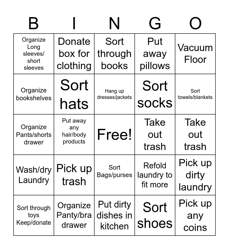 This bingo card has a free space and 24 words: Pick up trash, Organize Panty/bra drawer, Hang up dresses/jackets, Sort through toys Keep/donate, Vacuum Floor, Organize Long sleeves/ short sleeves, Organize bookshelves, Donate box for clothing, Take out trash, Sort Bags/purses, Sort socks, Organize Pants/shorts drawer, Refold laundry to fit more, Pick up dirty laundry, Sort hats, Sort shoes, Take out trash, Sort through books, Sort towels/blankets, Put away any hair/body products, Pick up any coins, Wash/dry Laundry, Put away pillows and Put dirty dishes in kitchen.