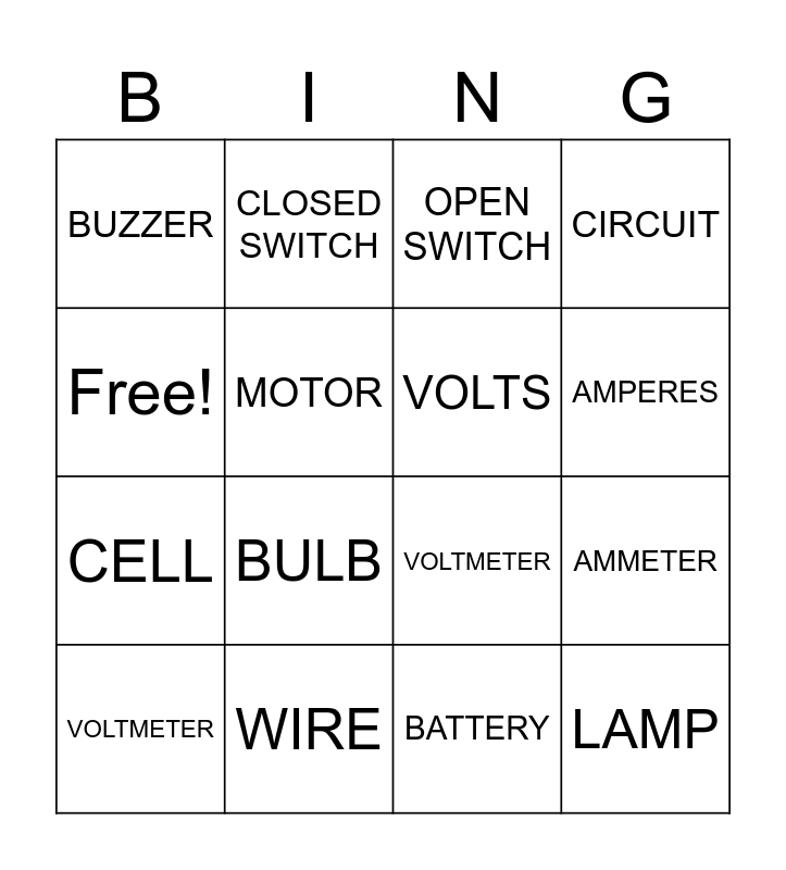 This bingo card has 16 words: WIRE, AMMETER, OPEN SWITCH, BUZZER, CELL, CLOSED SWITCH, VOLTMETER, BATTERY, Free!, MOTOR, VOLTMETER, CIRCUIT, BULB, AMPERES, VOLTS and LAMP.