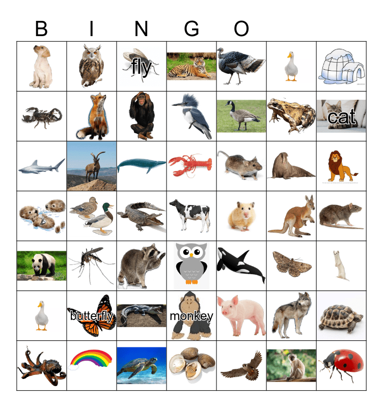 This bingo card has 84 images, a free space and 7 words: mouse, monkey, fly, bear, butterfly, cat and alligator.