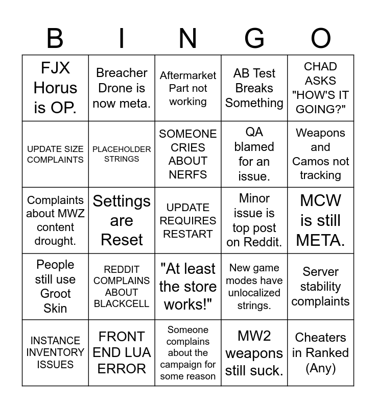 This bingo card has a free space and 24 words: REDDIT COMPLAINS ABOUT BLACKCELL, FRONT END LUA ERROR, SOMEONE CRIES ABOUT NERFS, INSTANCE INVENTORY ISSUES, CHAD ASKS "HOW'S IT GOING?", FJX Horus is OP., UPDATE SIZE COMPLAINTS, Breacher Drone is now meta., Minor issue is top post on Reddit., "At least the store works!", QA blamed for an issue., Complaints about MWZ content drought., New game modes have unlocalized strings., Server stability complaints, PLACEHOLDER STRINGS, MW2 weapons still suck., MCW is still META., Aftermarket Part not working, Weapons and Camos not tracking, Settings are Reset, Cheaters in Ranked (Any), People still use Groot Skin, AB Test Breaks Something and Someone complains about the campaign for some reason.
