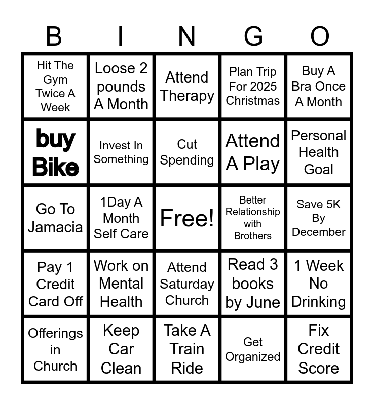 This bingo card has a free space and 24 words: Work on Mental Health, Keep Car Clean, Cut Spending, Offerings in Church, Buy A Bra Once A Month, Hit The Gym Twice A Week, buy Bike, Loose 2 pounds A Month, Better Relationship with Brothers, Attend Saturday Church, Attend A Play, Go To Jamacia, Read 3 books by June, 1 Week No Drinking, Invest In Something, Get Organized, Save 5K By December, Attend Therapy, Personal Health Goal, 1Day A Month Self Care, Fix Credit Score, Pay 1 Credit Card Off, Plan Trip For 2025 Christmas and Take A Train Ride.