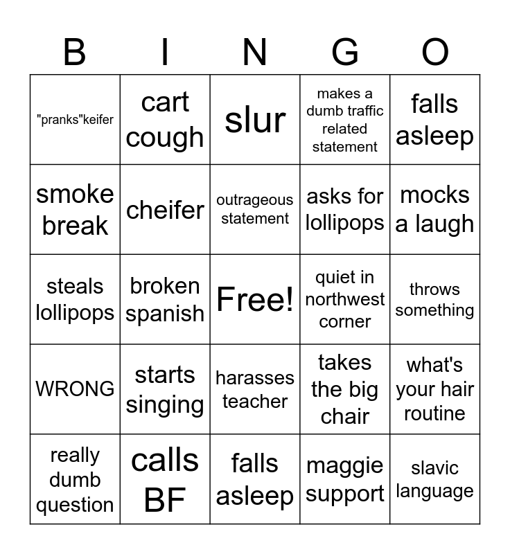This bingo card has a free space and 24 words: starts singing, calls BF, outrageous statement, really dumb question, falls asleep, "pranks"keifer, smoke break, cart cough, quiet in northwest corner, harasses teacher, asks for lollipops, steals lollipops, takes the big chair, what's your hair routine, cheifer, maggie support, throws something, slur, mocks a laugh, broken spanish, slavic language, WRONG, makes a dumb traffic related statement and falls asleep.