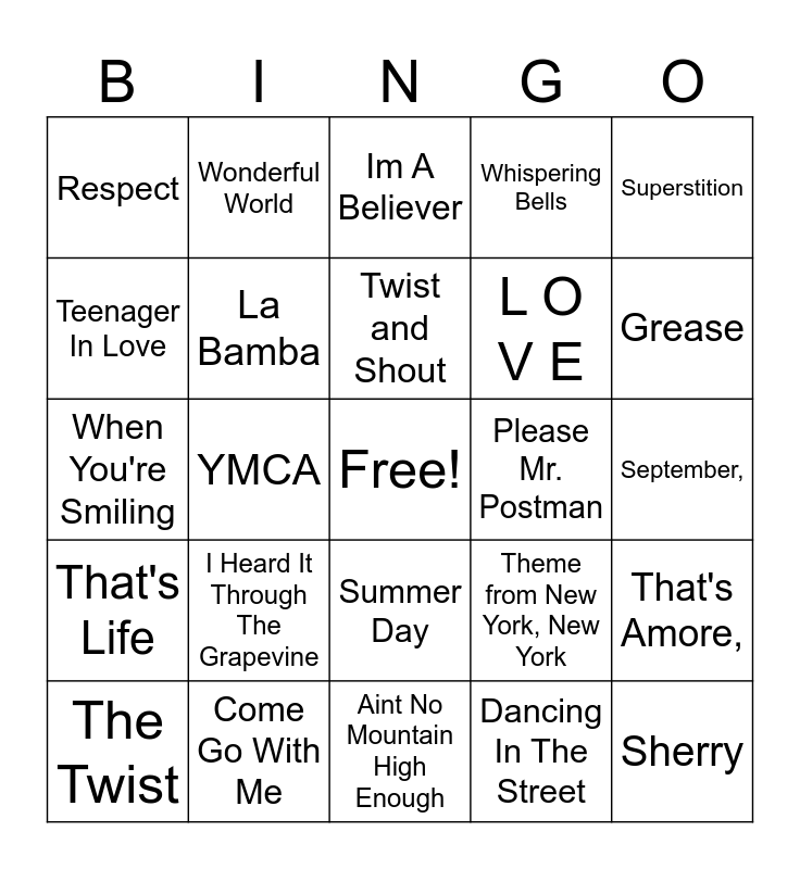 This bingo card has a free space and 25 words: I Heard It Through The Grapevine, Aint No Mountain High Enough, Twist and Shout, The Twist, Superstition, Respect, Teenager In Love, Wonderful World, Please Mr. Postman, Summer Day, L O V E, When You're Smiling, Theme from New York, New York, That's Amore,, La Bamba, Brown Eyed Girl, September,, Im A Believer, Grease, YMCA, Sherry, Come Go With Me, That's Life, Whispering Bells and Dancing In The Street.
