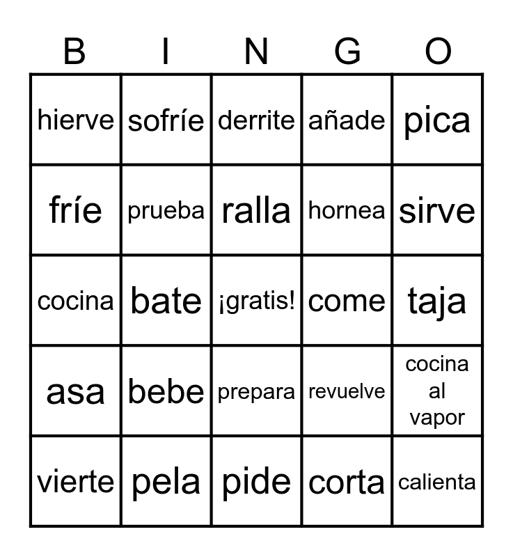 This bingo card has a free space and 26 words: prepara, corta, ralla, pela, pica, hierve, fríe, sofríe, taja, revuelve, hornea, cocina, cocina al vapor, vierte, bate, mezcla, añade, asa, derrite, calienta, sirve, pide, come, bebe, prueba and trocea.