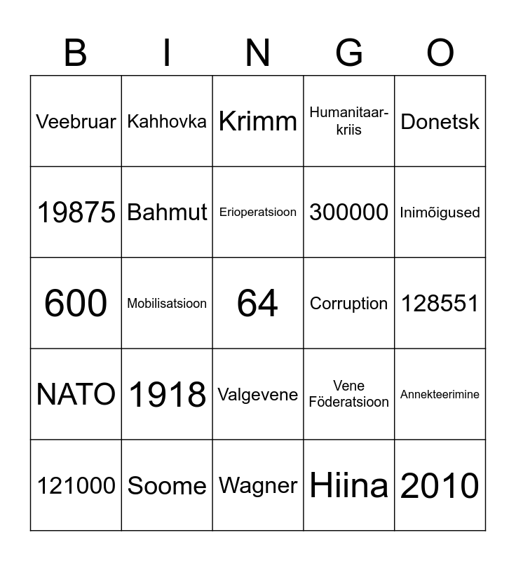 This bingo card has 41 words: Budapest, 600, Mariupol, Bahmut, Soome, Valgevene, Erioperatsioon, Oranž, Donetsk, NATO, Mobilisatsioon, Humanitaar-kriis, 64, 128551, Corruption, 1918, Euromaidan, Veebruar, Sanktsioonid, Krimm, Annekteerimine, 2010, Wagner, 300000, Massimõrv, Rootsi, Hiina, 1991, Inimõigused, Iraan, 400, Kahhovka, 121000, 536, Vene Föderatsioon, 19875, 2022, Luhansk, Donbas, Kiiev and Nõukogude Liit.