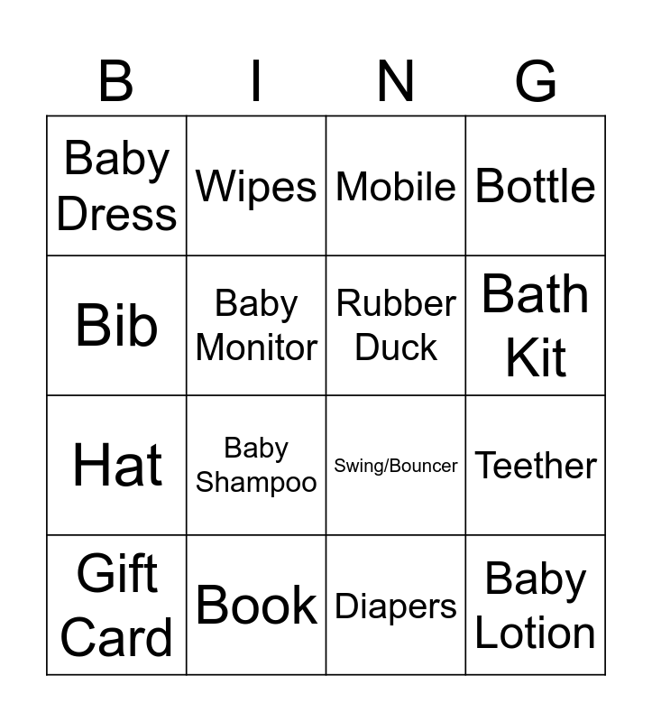 This bingo card has 38 words: Blanket, High Chair, Stuffed Animal, Rubber Duck, Changing Pad, Baby Outfit (top and bottom), Bath Kit, Baby Powder, Bib, Hat, Teether, Bottle, Gift Card, Diapers, Baby Monitor, Baby Lotion, Towel, Mobile, Baby Socks, Book, Baby Dress, Onesie, Baby Shampoo, Diaper Bag, Burp Cloth, Bottle Rack, Pacifier/Binky, Doll, Mittens, Baby Bath Tub, Sleep Sack, Booties, Blocks, Wipes, Rattle, Play Mat, Swing/Bouncer and Bath Toys.