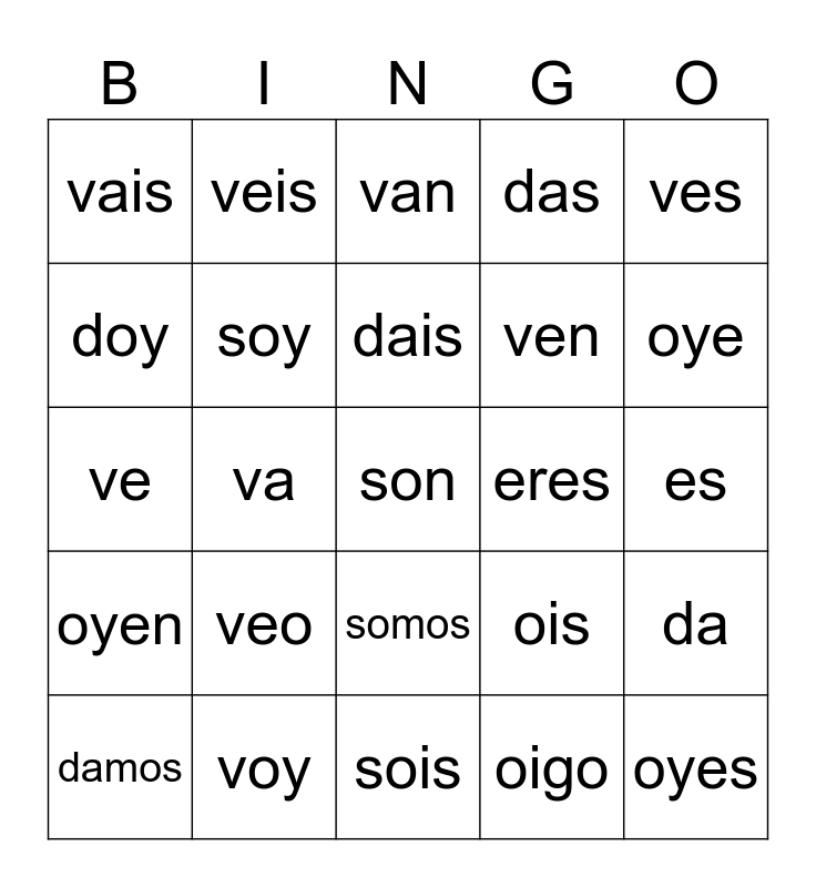 This bingo card has 30 words: voy, vas, va, vamos, vais, van, soy, somos, eres, sois, es, son, oigo, oyes, oye, oimos, ois, oyen, veo, ves, ve, vemos, veis, ven, doy, das, da, damos, dais and dan.