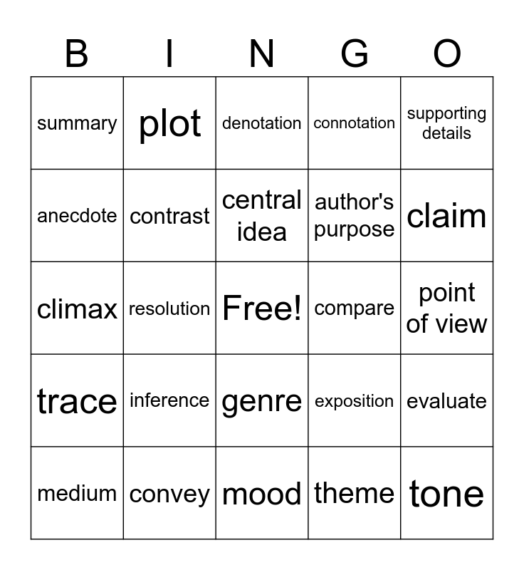 This bingo card has a free space and 26 words: genre, theme, central idea, convey, supporting details, summary, anecdote, plot, point of view, exposition, author's purpose, climax, evaluate, medium, resolution, coherent, connotation, trace, denotation, tone, claim, mood, compare, inference, contrast and textual evidence.
