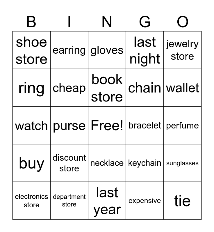 This bingo card has a free space and 24 words: discount store, department store, book store, electronics store, jewelry store, shoe store, ring, earring, bracelet, necklace, chain, watch, keychain, sunglasses, cheap, expensive, perfume, gloves, wallet, purse, tie, buy, last night and last year.