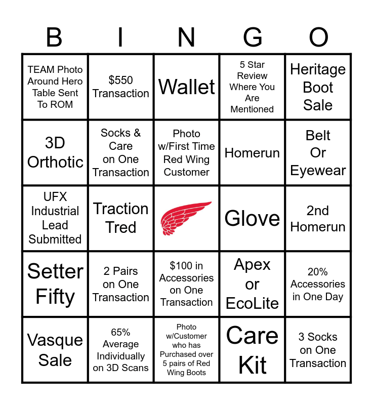 This bingo card has a free space and 24 words: 2 Pairs on One Transaction, 65% Average Individually on 3D Scans, Photo w/First Time Red Wing Customer, Vasque Sale, Heritage Boot Sale, TEAM Photo Around Hero Table Sent To ROM, 3D Orthotic, $550 Transaction, Glove, $100 in Accessories on One Transaction, Homerun, UFX Industrial Lead Submitted, Apex or EcoLite, 20% Accessories in One Day, Socks & Care on One Transaction, Care Kit, 2nd Homerun, Wallet, Belt Or Eyewear, Traction Tred, 3 Socks on One Transaction, Setter Fifty, 5 Star Review Where You Are Mentioned and Photo w/Customer who has Purchased over 5 pairs of Red Wing Boots.
