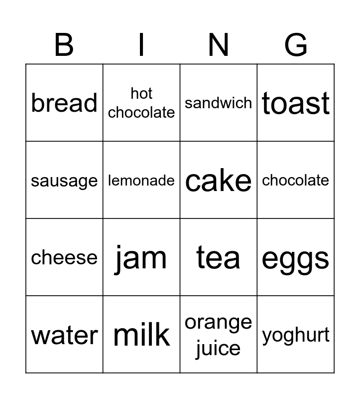 This bingo card has 16 words: milk, eggs, sandwich, bread, cheese, hot chocolate, tea, orange juice, sausage, lemonade, water, toast, jam, chocolate, cake and yoghurt.