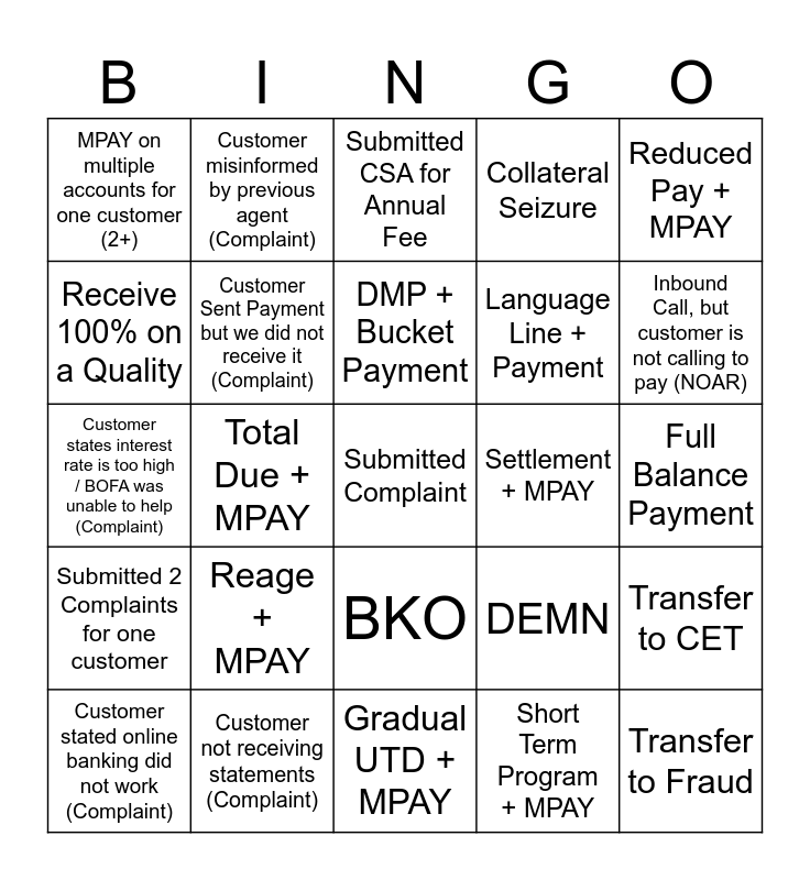 This bingo card has a free space and 24 words: Reage + MPAY, Customer not receiving statements (Complaint), DMP + Bucket Payment, Customer stated online banking did not work (Complaint), Reduced Pay + MPAY, MPAY on multiple accounts for one customer (2+), Receive 100% on a Quality, Customer misinformed by previous agent (Complaint), Settlement + MPAY, BKO, Language Line + Payment, Customer states interest rate is too high / BOFA was unable to help (Complaint), DEMN, Transfer to CET, Customer Sent Payment but we did not receive it (Complaint), Short Term Program + MPAY, Full Balance Payment, Submitted CSA for Annual Fee, Inbound Call, but customer is not calling to pay (NOAR), Total Due + MPAY, Transfer to Fraud, Submitted 2 Complaints for one customer, Collateral Seizure and Gradual UTD + MPAY.