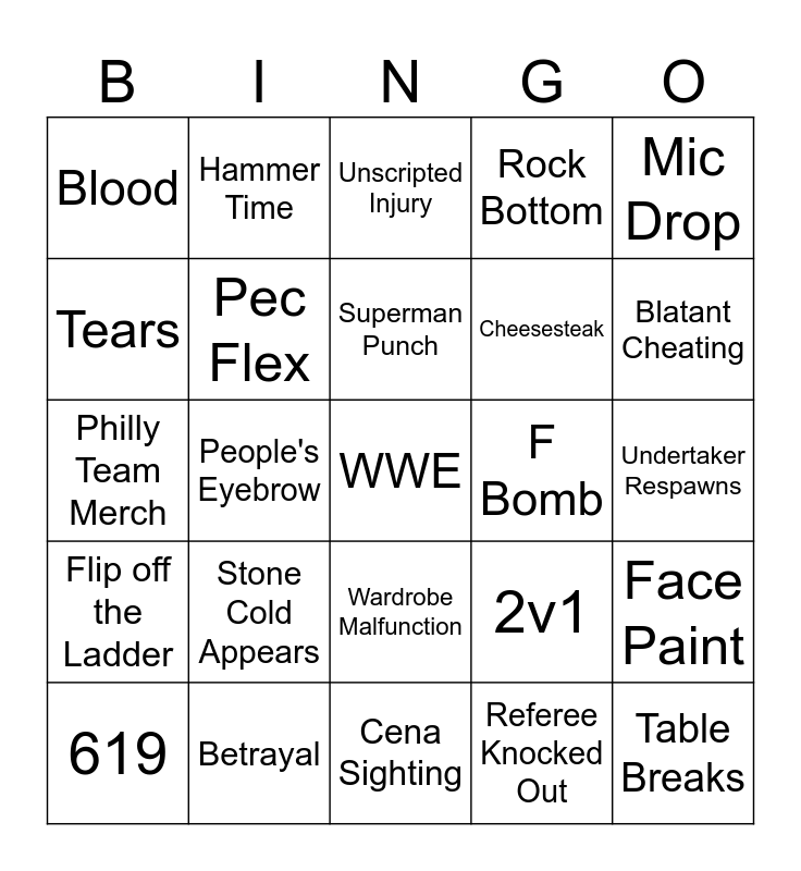 This bingo card has a free space and 29 words: 619, Chair Smash, People's Eyebrow, Hair Grabbing, Blood, Unscripted Injury, Pec Flex, Stone Cold Appears, F Bomb, Betrayal, Undertaker Respawns, Table Breaks, Cena Sighting, Referee Knocked Out, Blatant Cheating, Non-WWE Celeb, Wardrobe Malfunction, Flip off the Ladder, Mic Drop, Philly Team Merch, 2v1, "You Suck" Chant, Cheesesteak, Tears, Rock Bottom, Hammer Time, Face Paint, Superman Punch and Backstage Attack.