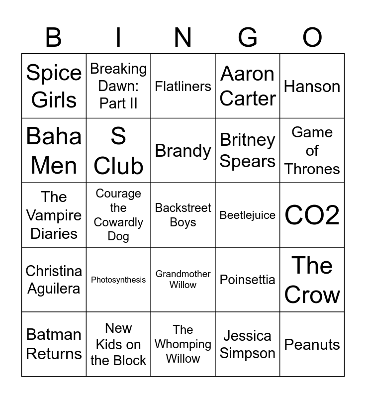 This bingo card has 60 words: Destiny’s Child, New Kids on the Block, *NSYNC, Christina Aguilera, Jessica Simpson, 98°, S Club, LFO, Britney Spears, Jennifer Lopez, Aaron Carter, Mandy Moore, Baha Men, B*Witched, Dream, Spice Girls, Backstreet Boys, Hanson, A*Teens, Brandy, Beetlejuice, Flatliners, Batman Returns, The Crow, Alien: Resurrection, Robocop, Hellraiser, Buffy the Vampire Slayer, Game of Thrones, Pushing Daisies, Dead Like Me, Soul, Supernatural, Lisa Frankenstein, Breaking Dawn: Part II, Just Like Heaven, Chilling Adventures of Sabrina, Courage the Cowardly Dog, What We Do in the Shadows, The Vampire Diaries, Tequila, Photosynthesis, CO2, Perennial, Poinsettia, Poppy, The Wizard of Oz, Tomatoes, Total Eclipse of the Sun, Grandmother Willow, The Whomping Willow, Treebeard, Truffula Trees, Great Deku Tree, The Orchid Thief, Astrobotany, Fantasia, Groot, Peanuts and Wumpa.