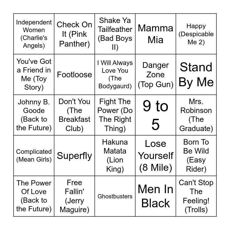 This bingo card has 39 words: Eye of the Tiger (Rocky IV), The Time Of My Life (Dirty Dancing), My Heart Will Go On (Titanic), Footloose, The Power Of Love (Back to the Future), Hakuna Matata (Lion King), I Will Always Love You (The Bodygaurd), Accidentally In Love (Shrek 2), Happy (Despicable Me 2), Complicated (Mean Girls), Don't You (The Breakfast Club), Mamma Mia, Fight The Power (Do The Right Thing), Mrs. Robinson (The Graduate), 9 to 5, Superfly, Gangsta's Paradise (Dangerous Minds), Independent Women (Charlie's Angels), Call Me (American Gigolo), Lose Yourself (8 Mile), You've Got a Friend in Me (Toy Story), Ghostbusters, Danger Zone (Top Gun), Stand By Me, La Bamba, St. Elmos Fire, Can't Stop The Feeling! (Trolls), Shakedown (Beverly Hills Cop II), Two Hearts (Buster), Check On It (Pink Panther), You're The One That I Want (Grease), Here Comes The Hotstepper (Pret-A-Porter), Shake Ya Tailfeather (Bad Boys II), Free Fallin' (Jerry Maguire), Men In Black, Bohemian Rhapsody (Wayne's World), Born To Be Wild (Easy Rider), Johnny B. Goode (Back to the Future) and I Don't Want to Miss a Thing (Armageddon).