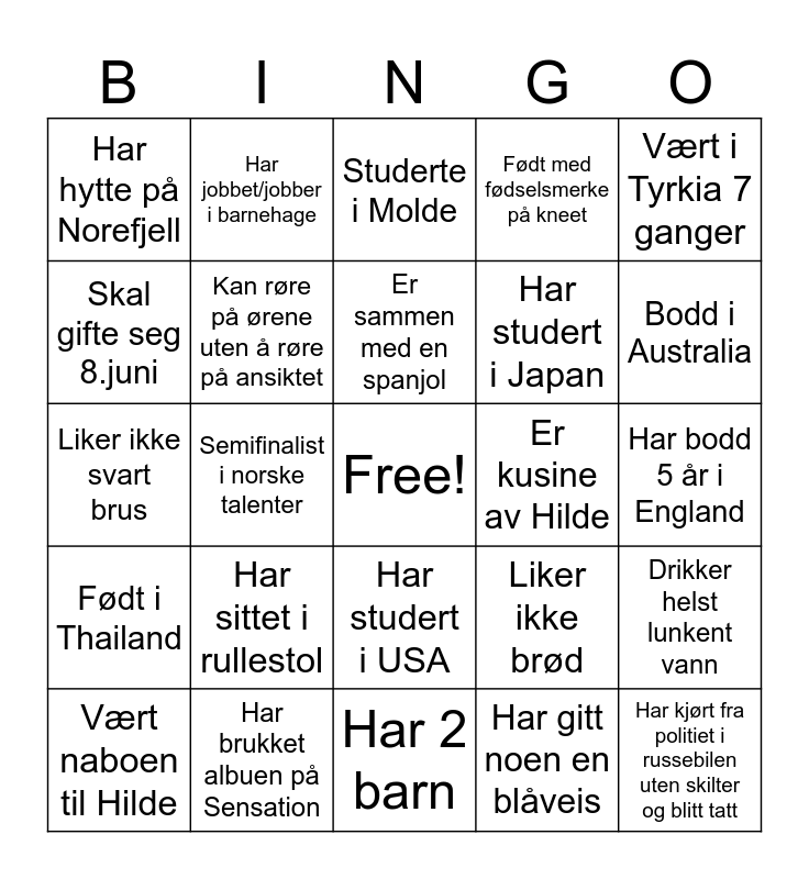 This bingo card has a free space and 24 words: Har sittet i rullestol, Har brukket albuen på Sensation, Er sammen med en spanjol, Vært naboen til Hilde, Vært i Tyrkia 7 ganger, Har hytte på Norefjell, Skal gifte seg 8.juni, Har jobbet/jobber i barnehage, Er kusine av Hilde, Har studert i USA, Har studert i Japan, Liker ikke svart brus, Liker ikke brød, Drikker helst lunkent vann, Kan røre på ørene uten å røre på ansiktet, Har gitt noen en blåveis, Har bodd 5 år i England, Studerte i Molde, Bodd i Australia, Semifinalist i norske talenter, Har kjørt fra politiet i russebilen uten skilter og blitt tatt, Født i Thailand, Født med fødselsmerke på kneet and Har 2 barn.