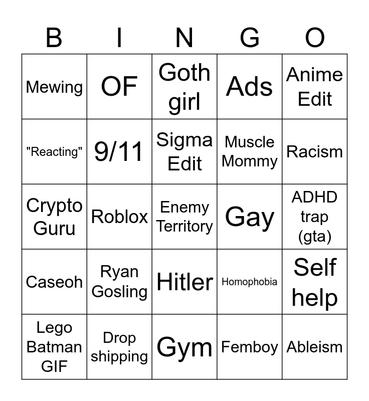 This bingo card has 25 words: Ryan Gosling, Gym, Sigma Edit, Lego Batman GIF, Anime Edit, Mewing, "Reacting", OF, Gay, Hitler, Muscle Mommy, Crypto Guru, Homophobia, Self help, 9/11, Ableism, ADHD trap (gta), Goth girl, Racism, Roblox, Enemy Territory, Drop shipping, Caseoh, Ads and Femboy.