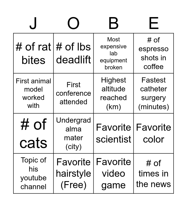 This bingo card has 16 words: Favorite hairstyle (Free), Favorite color, Most expensive lab equipment broken, # of rat bites, # of cats, # of lbs deadlift, Favorite scientist, Favorite video game, First animal model worked with, First conference attended, Topic of his youtube channel, # of espresso shots in coffee, Undergrad alma mater (city), Fastest catheter surgery (minutes), Highest altitude reached (km) and # of times in the news.