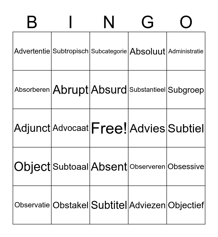 This bingo card has a free space and 35 words: Abces, Abdij, Abnormaal, Abrupt, Absent, Absoluut, Absorberen, Abstract, Absurd, Adjudant, Adjunct, Administratie, Admiraal, Advent, Advertentie, Advies, Adviezen, Advocaat, Object, Objectief, Observeren, Observatie, Obsessive, Obstakel, Subcategorie, Subgroep, Subsididie, Substantie, Substantieel, Subtiel, Subtitel, Subtitel, Subtoaal, Subtropisch and Administratiekosten.