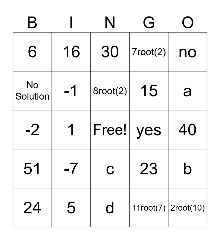 This bingo card has a free space and 24 words: -7, 5, 8root(2), 24, no, 6, No Solution, 16, yes, c, 15, -2, 23, b, -1, 11root(7), 40, 30, a, 1, 2root(10), 51, 7root(2) and d.