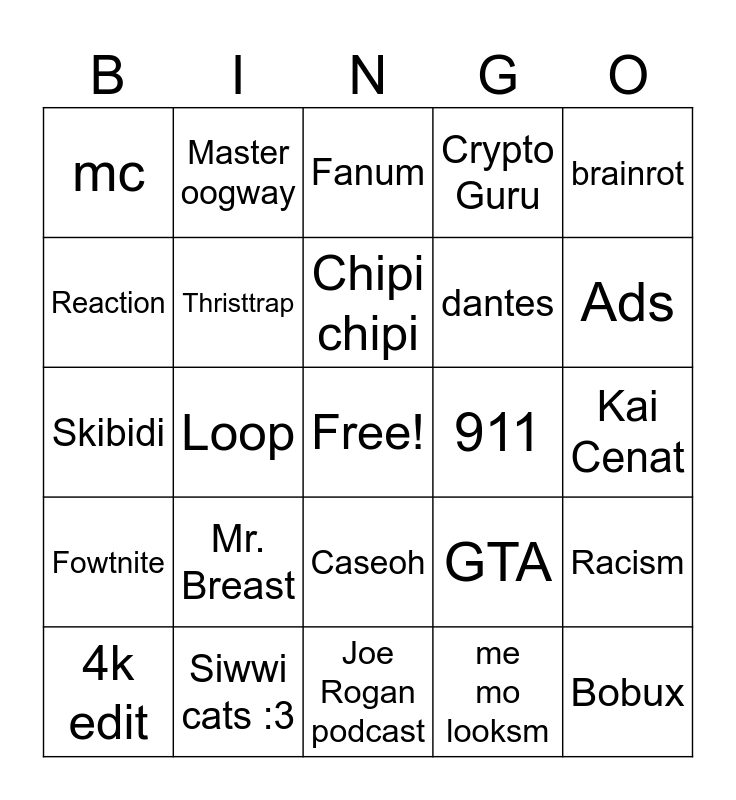 This bingo card has a free space and 24 words: Mr. Breast, Siwwi cats :3, Chipi chipi, 4k edit, brainrot, mc, Reaction, Master oogway, 911, Caseoh, dantes, Skibidi, GTA, Racism, Thristtrap, me mo looksm, Kai Cenat, Fanum, Ads, Loop, Bobux, Fowtnite, Crypto Guru and Joe Rogan podcast.