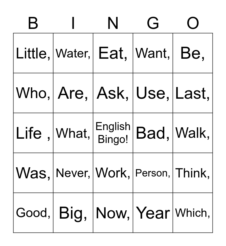 This bingo card has a free space and 38 words: We,, Because,, How,, Are,, Think,, Never,, Ask,, Travel,, Be,, Use,, What,, Want,, Which,, Walk,, Who,, Was,, Try,, Eat,, Drink,, Bad,, Little,, Big,, Last,, Good,, Always,, Now,, Only,, Place,, Way,, Week,, Woman,, Work,, Year, Water,, Time,, Person,, Life , and When.