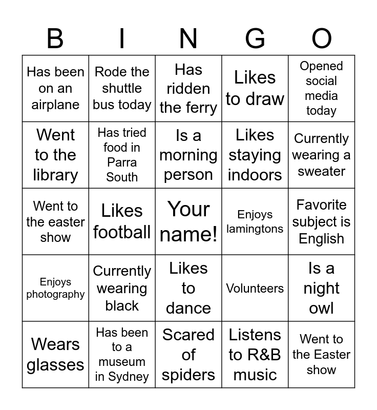 This bingo card has a free space and 99 words: Drinks coffee, Exercises daily, Likes reading books, Has ridden the ferry, Has food allergies, Same birth month as you, Has borrowed a book in the library, Owns WSU merchandise, Plays video games, Loves math, Has a pet, Has a birthday this month, Went to the beach recently, Likes to dance, Likes winter more than summer, Has been on an airplane, Rode the shuttle bus today, Went to class today, Can touch their toes, Loves flowers, Can speak a foreign language, Watches TV shows and movies, Likes sports, Likes fruits over vegetables, Has piercings, tattoos or nail polish, Is a night owl, Is a morning person, Has a sibling, Likes vegemite, Studies something related to health or sciences, Scared of spiders, Listens to R&B music, Listens to pop music, Enjoys karaoke, Likes football, Went to the easter show, Listens to podcasts, Has been to a concert, Uses Aussie slangs regularly, Currently wearing black, Currently wearing denim, Currently wearing a sweater, Likes to draw, Has been to a museum in Sydney, Likes tea, Has taken the light rail, In their first year at university, In their second year at university, In their last year at university, Practices meditation or yoga, Enjoys cooking, Went to the Easter show, Volunteers, Enjoys writing, Has done a DIY project, Owns a LinkedIn account, Likes cold drinks, Like hot drinks, Learning a new language, Goes to work, Enjoys gardening, Has checked student emails today, Reads fiction, Reads non-fiction, Walked around Parramatta before, Opened social media today, Slept late last night, Writing diary or journal entries, Has joined a student club, Enjoys photography, Likes staying outdoors, Likes staying indoors, Went to the library, Is left-handed, Has travelled recently, Joined MATES or ECG, Has tried food in Parra South, Has completed the Academic Integration Module, Tried wine tasting, Enjoys vegemite, Enjoys lamingtons, Timtam as favorite chocolate, Your name, Has dyed hair, Visited another continent, Cried while watching a movie, Bought something online, Knows how to drive a vehicle, Favorite subject is English, Wears glasses, Was born in Australia, Was born in another country, Has attended orientation day, Is carrying their phone, Ordered on any food app like UberEats, Has went to Woolies or Coles this week, Plays an instrument, Studies masters or PhD and Has a sweet tooth.