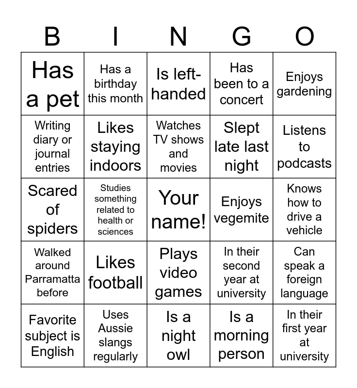 This bingo card has a free space and 99 words: Plays an instrument, Studies masters or PhD, Has a sweet tooth, Is left-handed, Has travelled recently, Drinks coffee, Exercises daily, Likes reading books, Has ridden the ferry, Has food allergies, Same birth month as you, Has borrowed a book in the library, Owns WSU merchandise, Plays video games, Loves math, Has a pet, Has a birthday this month, Went to the beach recently, Likes to dance, Likes winter more than summer, Has been on an airplane, Rode the shuttle bus today, Went to class today, Can touch their toes, Loves flowers, Can speak a foreign language, Watches TV shows and movies, Likes sports, Likes fruits over vegetables, Has piercings, tattoos or nail polish, Is a night owl, Is a morning person, Has a sibling, Likes vegemite, Studies something related to health or sciences, Scared of spiders, Listens to R&B music, Listens to pop music, Enjoys karaoke, Likes football, Went to the easter show, Listens to podcasts, Has been to a concert, Uses Aussie slangs regularly, Currently wearing black, Currently wearing denim, Currently wearing a sweater, Likes to draw, Has been to a museum in Sydney, Likes tea, Has taken the light rail, In their first year at university, In their second year at university, In their last year at university, Practices meditation or yoga, Enjoys cooking, Went to the Easter show, Volunteers, Enjoys writing, Has done a DIY project, Owns a LinkedIn account, Likes cold drinks, Like hot drinks, Learning a new language, Goes to work, Enjoys gardening, Has checked student emails today, Reads fiction, Reads non-fiction, Walked around Parramatta before, Opened social media today, Slept late last night, Writing diary or journal entries, Has joined a student club, Enjoys photography, Likes staying outdoors, Likes staying indoors, Went to the library, Has completed the Academic Integration Module, Tried wine tasting, Enjoys vegemite, Enjoys lamingtons, Timtam as favorite chocolate, Your name, Has dyed hair, Visited another continent, Cried while watching a movie, Bought something online, Knows how to drive a vehicle, Favorite subject is English, Wears glasses, Was born in Australia, Was born in another country, Has attended orientation day, Is carrying their phone, Ordered on any food app like UberEats, Has went to Woolies or Coles this week, Joined MATES or ECG and Has tried food in Parra South.