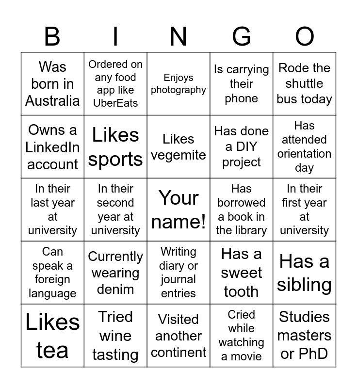 This bingo card has a free space and 99 words: Currently wearing a sweater, Likes to draw, Has been to a museum in Sydney, Enjoys photography, Likes staying outdoors, Likes fruits over vegetables, Has piercings, tattoos or nail polish, Has checked student emails today, Reads fiction, Reads non-fiction, Walked around Parramatta before, Opened social media today, Slept late last night, Writing diary or journal entries, Wears glasses, Was born in Australia, Ordered on any food app like UberEats, Listens to pop music, Is a night owl, Has been to a concert, Enjoys lamingtons, Timtam as favorite chocolate, Your name, Has dyed hair, Is a morning person, Has a sibling, Likes vegemite, Has ridden the ferry, Likes staying indoors, Went to the library, Visited another continent, Cried while watching a movie, Has went to Woolies or Coles this week, Has joined a student club, In their second year at university, In their last year at university, Practices meditation or yoga, Enjoys cooking, Went to the Easter show, Currently wearing denim, Was born in another country, Has attended orientation day, Is carrying their phone, Tried wine tasting, Enjoys vegemite, Bought something online, Knows how to drive a vehicle, Favorite subject is English, Joined MATES or ECG, Has tried food in Parra South, Plays an instrument, Studies masters or PhD, Has a sweet tooth, Loves math, Has a pet, Is left-handed, Has travelled recently, Drinks coffee, Exercises daily, Likes reading books, Has a birthday this month, Went to the beach recently, Likes to dance, Likes winter more than summer, Has been on an airplane, Rode the shuttle bus today, Went to class today, Can touch their toes, Loves flowers, Can speak a foreign language, Enjoys writing, Has done a DIY project, Owns a LinkedIn account, Likes cold drinks, Like hot drinks, Watches TV shows and movies, Likes sports, Has completed the Academic Integration Module, Has food allergies, Same birth month as you, Has borrowed a book in the library, Owns WSU merchandise, Plays video games, Studies something related to health or sciences, Scared of spiders, Listens to R&B music, Uses Aussie slangs regularly, Currently wearing black, In their first year at university, Likes tea, Has taken the light rail, Volunteers, Learning a new language, Goes to work, Enjoys gardening, Enjoys karaoke, Likes football, Went to the easter show and Listens to podcasts.