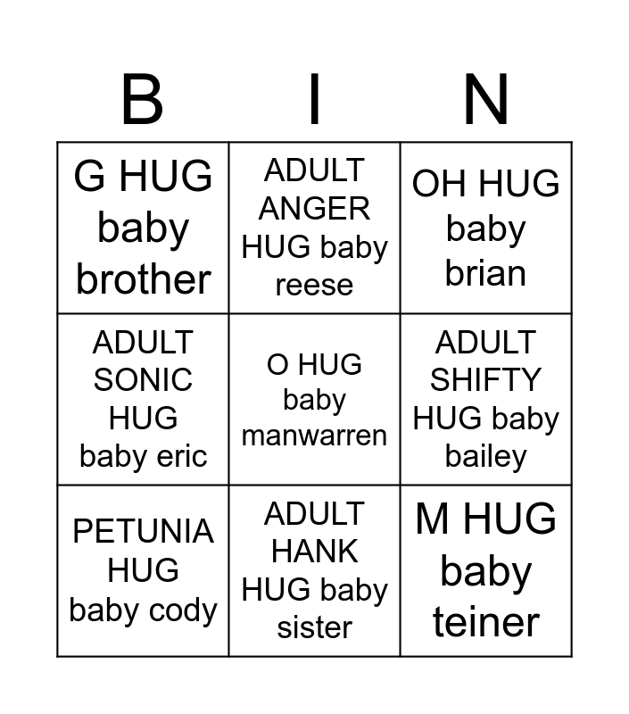 This bingo card has 9 words: PETUNIA HUG baby cody, OH HUG baby brian, ADULT ANGER HUG baby reese, ADULT SONIC HUG baby eric, G HUG baby brother, ADULT SHIFTY HUG baby bailey, O HUG baby manwarren, M HUG baby teiner and ADULT HANK HUG baby sister.