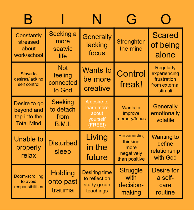 This bingo card has a free space and 29 words: Doom-scrolling to avoid responsibilities, Fear of silence with a need for constant external stimulation, Seeking to detach from B.M.I., Lazy and lethargic, can’t accomplish daily tasks, Constantly stressed about work/school, Generally lacking focus, Not feeling connected to God, Disturbed sleep, Wants to improve memory/focus, Holding onto past trauma, Generally emotionally volatile, Desire for a self-care routine, Desiring time to reflect on study group teachings, Struggle with decision-making, Regularly experiencing frustration from external stimuli, Living in the past, Living in the future, Unable to properly relax, Scared of being alone, Desire to go beyond and tap into the Total Mind, Pessimistic, thinking more negatively than positive, Leading an overall tamasic lifestyle (i.e. eating poorly, sleeping late, drinking, etc.), Control freak!, Slave to desires/lacking self control, Strenghten the mind, Seeking a more saatvic life, Wanting to define relationship with God, Wants to be more creative and Anti-aging.