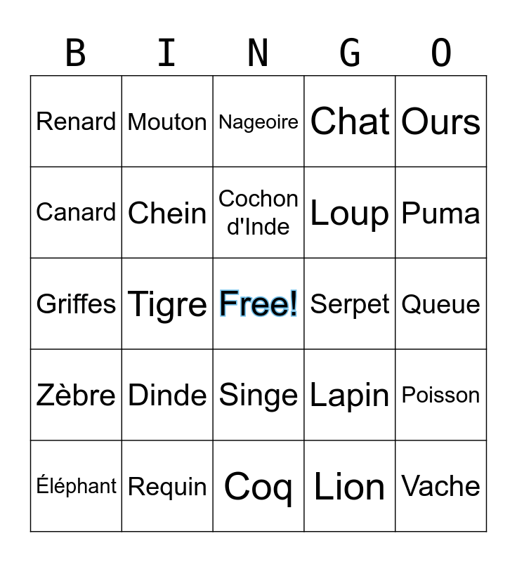 This bingo card has a free space and 49 words: Cochon, Vache, Poulet, Coq, Dinde, ChΓ¨vre, Mouton, Cheval, Canard, Oie, Chein, Chat, Poisson, Lapin, Osieau, Hamster, Cochon d'Inde, Serpet, Cerf, Ours, Tigre, Lion, Renard, Loup, Γcurevil, Puma, ΓlΓ©phant, Girafe, Singe, ZΓ¨bre, Hippopotame, RhinocΓ¨roe, Crocodie, Aligator, Requin, Baleine, Dauphin, Aile, Queue, Patte, CriniΓ¨re, Fourrure, Bec, Museau, Griffes, Nageoire, Animal sauvage, Animal de ferme and Animal de compagnie.