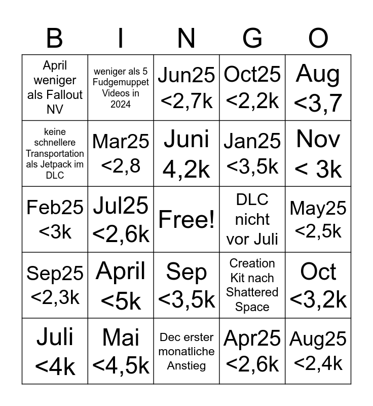 This bingo card has a free space and 24 words: April <5k, Mai <4,5k, Juni 4,2k, Juli <4k, Aug <3,7, April weniger als Fallout NV, keine schnellere Transportation als Jetpack im DLC, weniger als 5 Fudgemuppet Videos in 2024, DLC nicht vor Juli, Sep <3,5k, Jan25 <3,5k, Feb25 <3k, Creation Kit nach Shattered Space, Oct <3,2k, Mar25 <2,8, Apr25 <2,6k, May25 <2,5k, Jun25 <2,7k, Nov < 3k, Jul25 <2,6k, Aug25 <2,4k, Sep25 <2,3k, Oct25 <2,2k and Dec erster monatliche Anstieg.