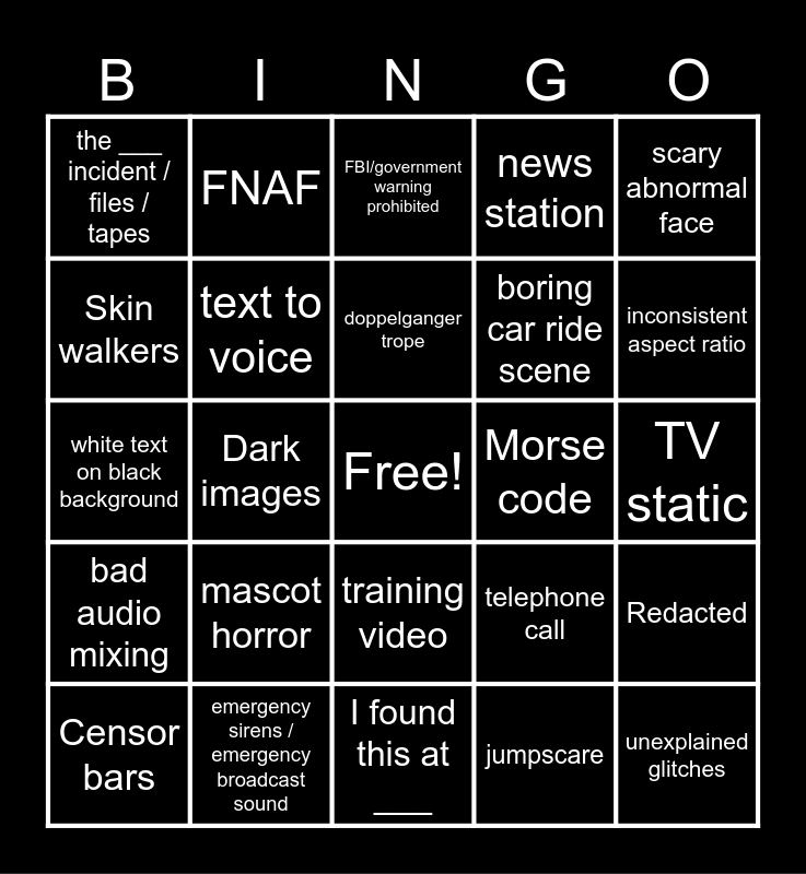 This bingo card has a free space and 34 words: Bad Vhs effect, jumpscare, text over filter, Loud sounds, bad audio mixing, text to voice, scary abnormal face, Censor bars, FNAF, dead kids, doppelganger trope, FBI/government warning prohibited, broadcast interruptions, Old-timey music, Morse code, inconsistent aspect ratio, emergency sirens / emergency broadcast sound, white text on black background, mascot horror, telephone call, training video, science gone wrong, the ___ incident / files / tapes, TV static, I found this at ___, unexplained glitches, news station, clearly a teenager doing an adult voice, boring car ride scene, Skin walkers, Door knocking, Dark images, Redacted and Zombie.