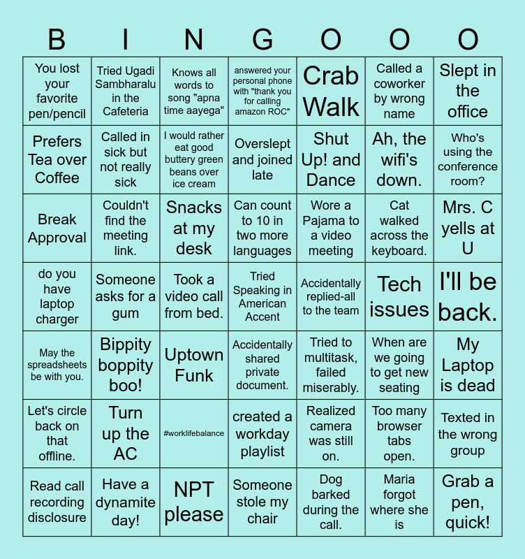 This bingo card has 56 words: Maria forgot where she is, Mrs. C yells at U, There is a bug/frog in the office, You lost your favorite pen/pencil, Someone asks for a gum, #worklifebalance, Slept in the office, Stood up during the entire meeting, Called in sick but not really sick, created a workday playlist, answered your personal phone with "thank you for calling amazon ROC", Let's circle back on that offline., May the spreadsheets be with you., I'll be back., Have a dynamite day!, Bippity boppity boo!, Crab Walk, Shut Up! and Dance, Grab a pen, quick!, Ah, the wifi's down., Who's using the conference room?, Uptown Funk, Wore a Pajama to a video meeting, Knows all words to song "apna time aayega", Can i share my desk with you, Prefers Tea over Coffee, Tech issues, Forgot to mute the mic., I would rather eat good buttery green beans over ice cream, Accidentally shared private document., Unmuted to clear my throat., My Laptop is dead, Read call recording disclosure, NPT please, Break Approval, Called a coworker by wrong name, Overslept and joined late, Turn up the AC, Couldn't find the meeting link., Tried Ugadi Sambharalu in the Cafeteria, Can count to 10 in two more languages, Tried Speaking in American Accent, Realized camera was still on., Forgot to turn off notifications., Texted in the wrong group, Snacks at my desk, do you have laptop charger, Someone stole my chair, When are we going to get new seating, Accidentally replied-all to the team, Took a video call from bed., Tried to multitask, failed miserably., Too many browser tabs open., Dog barked during the call., Cat walked across the keyboard. and Juggling work and home life..