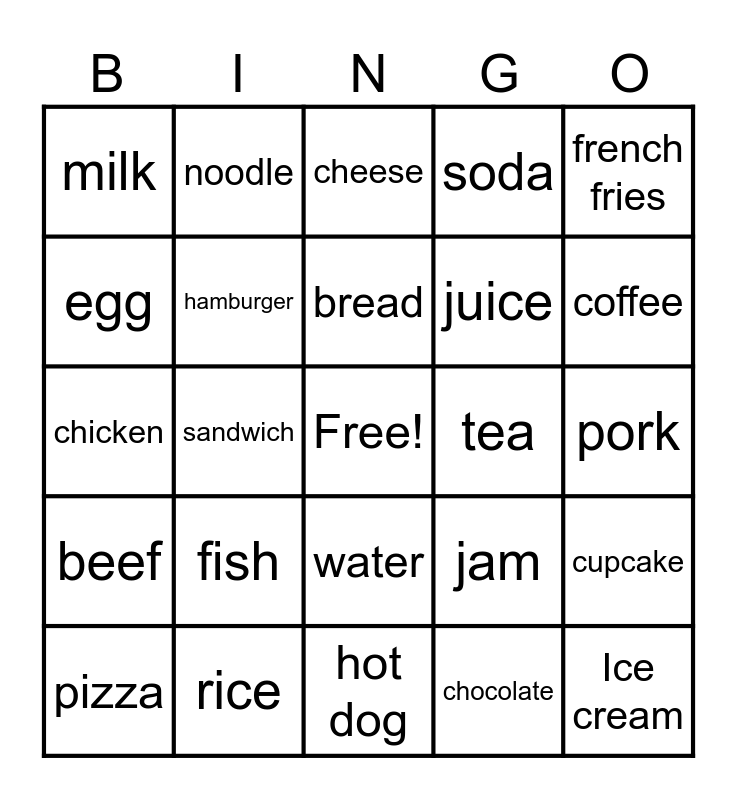 This bingo card has a free space and 24 words: fish, rice, bread, pizza, french fries, milk, egg, noodle, tea, water, juice, chicken, jam, cupcake, hamburger, chocolate, pork, cheese, coffee, sandwich, Ice cream, beef, soda and hot dog.