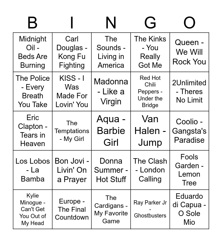 This bingo card has a free space and 24 words: Bon Jovi - Livin' On a Prayer, Europe - The Final Countdown, Madonna - Like a Virgin, Kylie Minogue - Can't Get You Out of My Head, Queen - We Will Rock You, Midnight Oil - Beds Are Burning, The Police - Every Breath You Take, Carl Douglas - Kong Fu Fighting, Van Halen - Jump, Donna Summer - Hot Stuff, Red Hot Chili Peppers - Under the Bridge, Eric Clapton - Tears in Heaven, The Clash - London Calling, Fools Garden - Lemon Tree, KISS - I Was Made For Lovin' You, Ray Parker Jr - Ghostbusters, Coolio - Gangsta's Paradise, The Sounds - Living in America, 2Unlimited - Theres No Limit, The Temptations - My Girl, Eduardo di Capua - O Sole Mio, Los Lobos - La Bamba, The Kinks - You Really Got Me and The Cardigans - My Favorite Game.