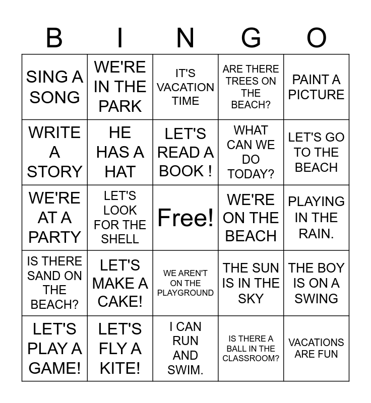 This bingo card has a free space and 24 words: LET'S MAKE A CAKE!, LET'S FLY A KITE!, LET'S READ A BOOK !, LET'S PLAY A GAME!, PAINT A PICTURE, SING A SONG, WRITE A STORY, WE'RE IN THE PARK, WE'RE ON THE BEACH, WE AREN'T ON THE PLAYGROUND, WHAT CAN WE DO TODAY?, WE'RE AT A PARTY, THE SUN IS IN THE SKY, THE BOY IS ON A SWING, HE HAS A HAT, IS THERE A BALL IN THE CLASSROOM?, PLAYING IN THE RAIN., IT'S VACATION TIME, LET'S GO TO THE BEACH, LET'S LOOK FOR THE SHELL, VACATIONS ARE FUN, IS THERE SAND ON THE BEACH?, ARE THERE TREES ON THE BEACH? and I CAN RUN AND SWIM..