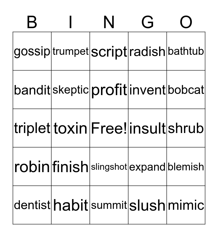This bingo card has a free space and 24 words: finish, habit, profit, dentist, bathtub, gossip, bandit, trumpet, insult, slingshot, invent, triplet, expand, blemish, skeptic, slush, shrub, script, bobcat, toxin, mimic, robin, radish and summit.
