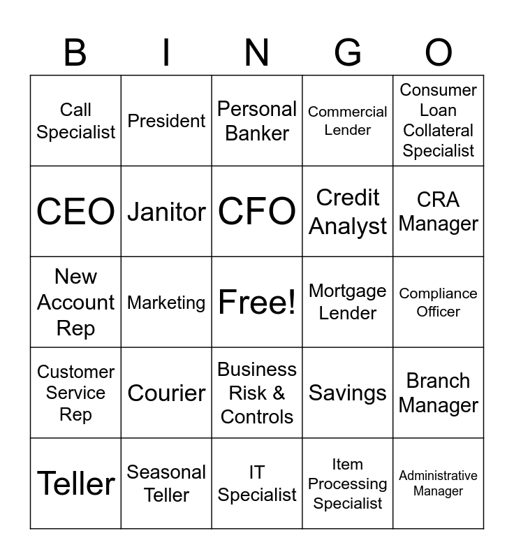 This bingo card has a free space and 36 words: Auditor, CA$H, Accountant, Janitor, Savings, Customer Service Rep, CFO, Customers, Consumer Loan Collateral Specialist, Investment Banker, Marketing, Commercial Lender, Cloud Endpoint Engineer, Mortgage Lender, CRA Manager, Call Specialist, Escrow Specialist, Courier, Administrative Manager, Personal Banker, Compliance Officer, Branch Manager, Seasonal Teller, Teller, IT Specialist, President, New Account Rep, Float Teller, Credit Analyst, CEO, Vice President, Cash Management, Item Processing Specialist, Business Risk & Controls, Human Resources and Security & Fraud Officer.