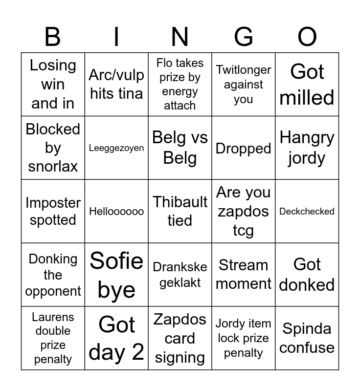 This bingo card has a free space and 24 words: Sofie bye, Got day 2, Belg vs Belg, Laurens double prize penalty, Got milled, Losing win and in, Blocked by snorlax, Arc/vulp hits tina, Are you zapdos tcg, Drankske geklakt, Dropped, Imposter spotted, Stream moment, Got donked, Leeggezoyen, Jordy item lock prize penalty, Deckchecked, Flo takes prize by energy attach, Hangry jordy, Helloooooo, Spinda confuse, Donking the opponent, Twitlonger against you and Zapdos card signing.