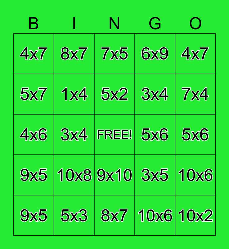 This bingo card has a free space and 51 words: 3x6, 10x2, 3x9, 8x7, 10x8, 6x2, 8x7, 10x7, 5x7, 6x9, 1x4, 6x9, 10x6, 3x5, 5x7, 8x6, 5x2, 5x6, 10x6, 4x7, 3x4, 10x6, 4x7, 3x4, 5x2, 6x9, 7x4, 8x7, 9x5, 7x5, 5x7, 3x2, 7x7, 2x8, 1x9, 5x3, 8x6, 2x2, 4x7, 7x0, 5x6, 9x5, 5x7, 8x3, 7x7, 5x9, 4x6, 9x8, 6x0, 9x10 and 8x3.